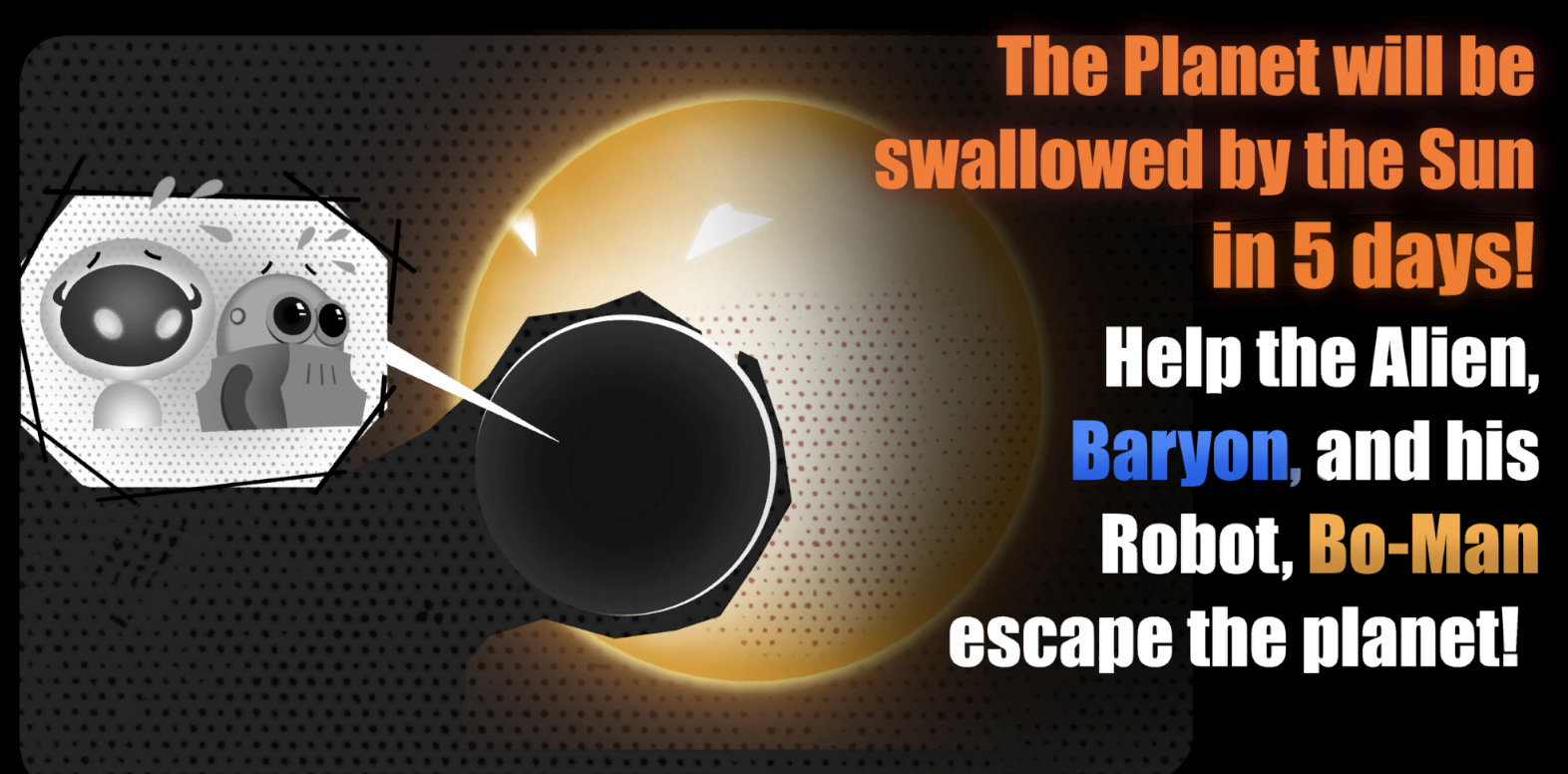 An Alien named Baryon and his Robot, Bo-Man, are stuck on a planet after their space ship collided with an asteroid! The planet rotates around the sun very quickly, and the Alien thrives in the night and overheats in the day, while the Robot thrives in the day and freezes at night. The two has special skills that the other is not able to do. You must control both the Alien and the Robot to work together so that they are able to rebuild their space ship before the sun burns the planet!